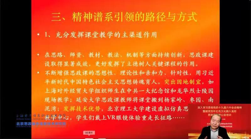开班仪式结束后,上海市中共党史学会副会长、中共上海市委党史研究室特约研究员、上海立信会计金融学院马克思主义学院徐光寿教授做了题为《用中国共产党人精神谱系引领新时代高校思政课教学》的首场讲座。徐教授分别从中国共产党人精神谱系的提出与内涵辨析、精神谱系引领的必要性与可行性、精神谱系引领的路径与方式等方面进行了全面深刻的分析,授课内容理论逻辑清晰,内涵丰富,在学员中引发强烈反响。后续培训还将陆续邀请北京大学政府管理学院教授关海庭、解放日报(思想周刊)·上观新闻上观学习栏目主编王多、中国人民大学马克思主义学院教授何虎生、上海对外经贸大学马克思主义学院院长秦淑娟、清华大学马克思主义学院教授刘书林、兰州大学马克思主义学院教授刘先春等专家学者带来精彩报告。