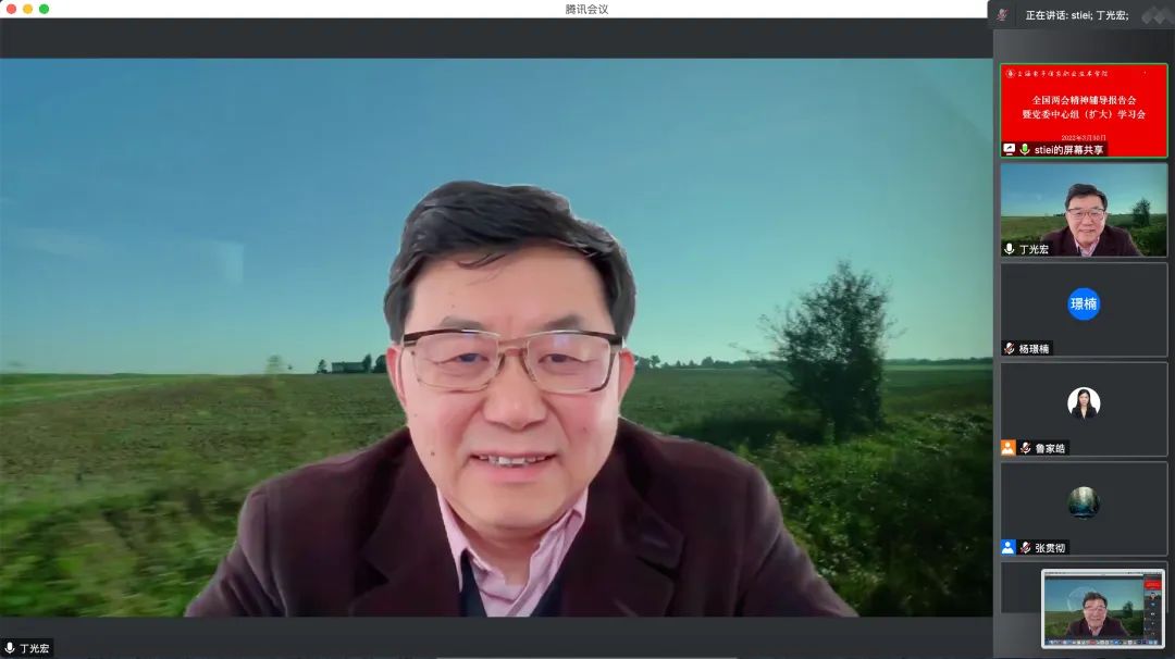 3月30日下午,学校举行全国两会精神辅导报告会暨党委中心组(扩大)学习会。会议邀请到民盟中央常委、上海市委专职副主委、全国人大代表、复旦大学教授丁光宏传达全国两会精神。校领导、全体中层干部、各二级单位中心组成员共计100余人参加学习会。学习会以线上线下相结合的方式进行,校党委书记田钦主持会议。