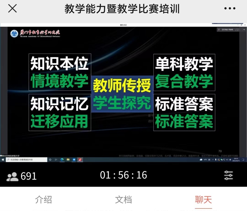 在答疑环节,两位专家耐心针对各位老师提出的有关教学反思改进、信息化手段使用、课程思政设计,以及教学增值评价等方面问题进行答疑解惑。培训一直持续到晚上9点40分,好评如潮。活动的成功举办,为365官网教师教育教学能力提升起到了一定的推动作用。(供稿单位:公共基础学院)