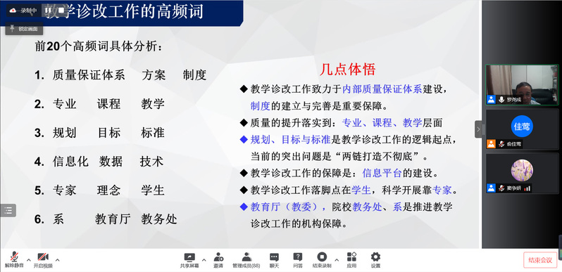 罗尧成教授从诊改工作理念、国内试点院校诊改方案框架对比、国内试点院校诊改工作实践、上海推进教学诊改的院校探索等方面进行了具体分析。罗教授从对教学诊改工作的高频词研究切入,探讨了诊改理念,并对国内试点院校诊改方案框架进行对比,聚焦院校间的考察交流、专门工作会议推进、专题活动开展、诊改相关培训等方面,分析了国内多所试点院校诊改工作实践和特色亮点。罗教授还对上海高职院校的教学诊改进行了分析,对深入推进诊改工作提出思考和建议。