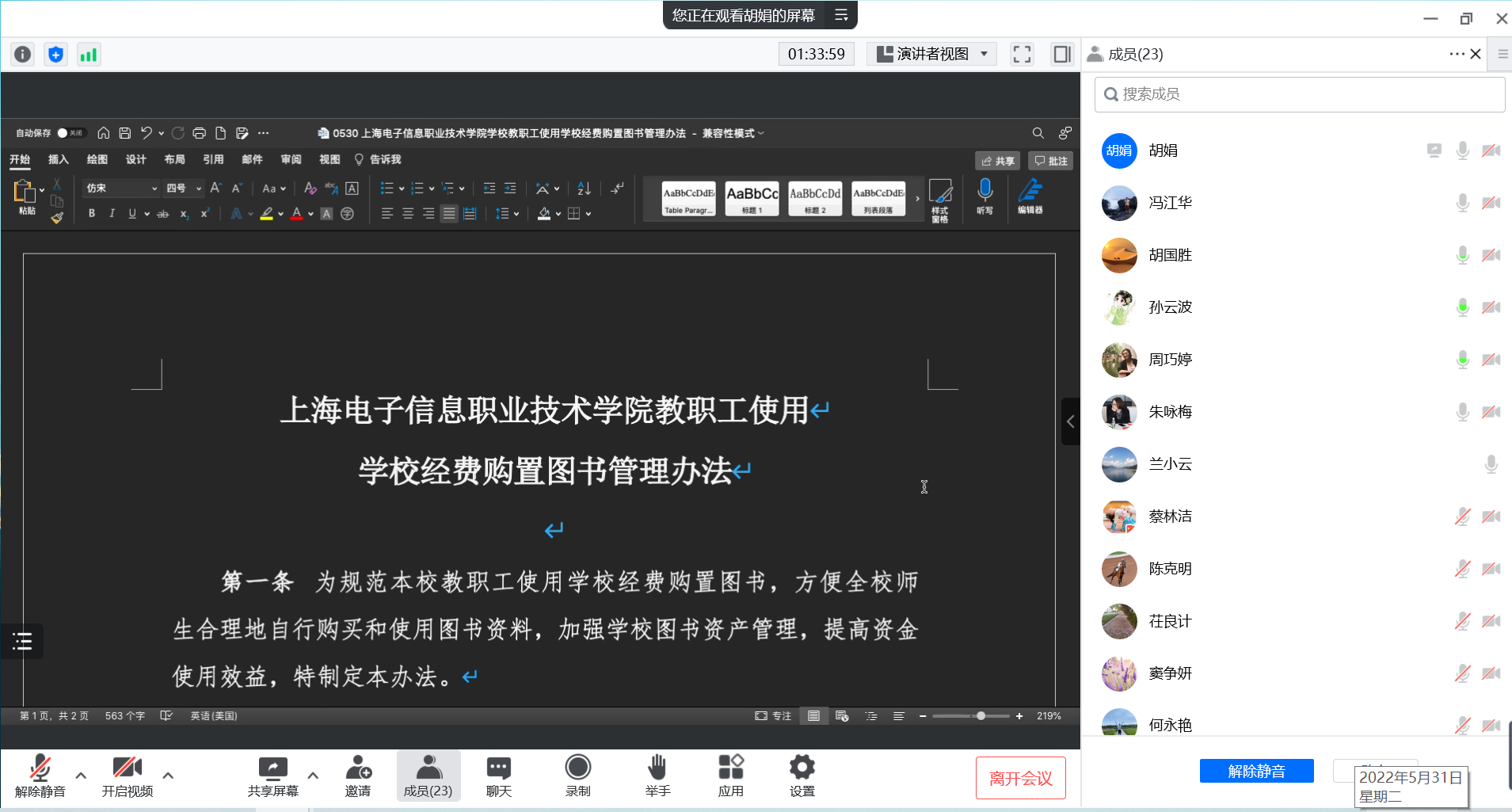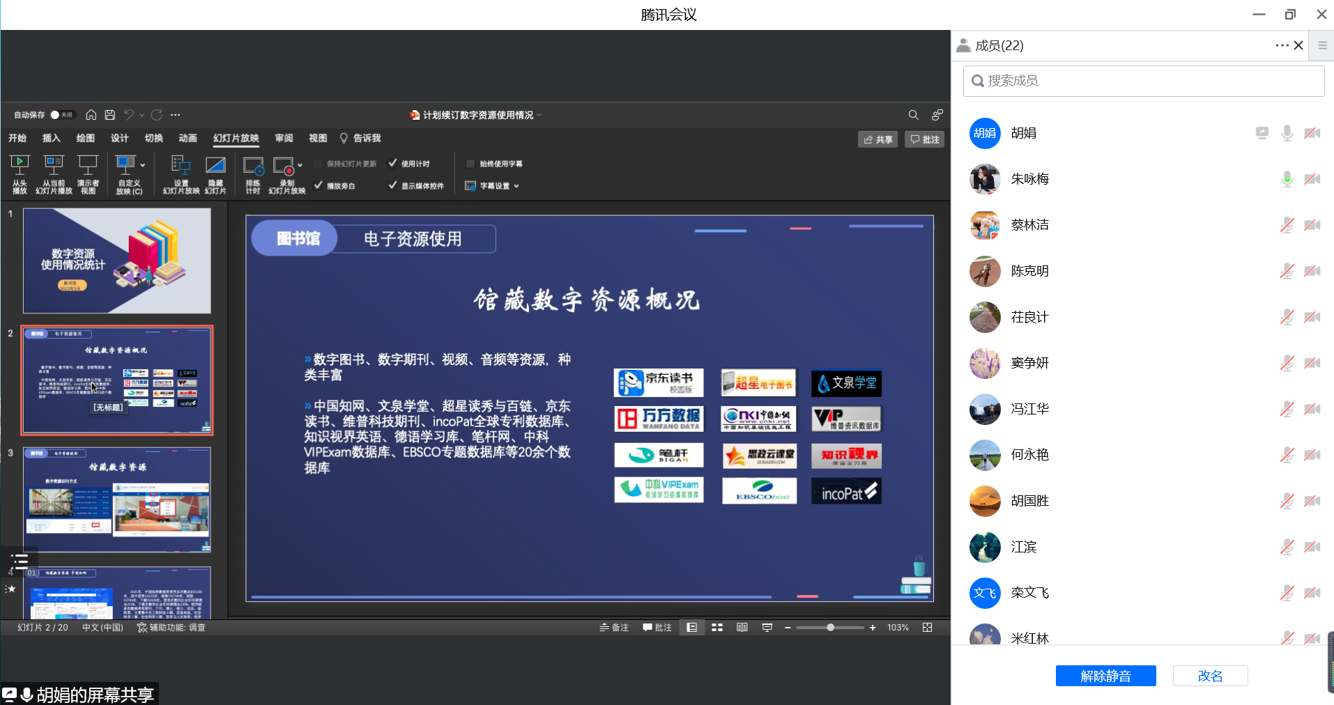 图书馆副馆长胡娟介绍了2021年数字资源使用情况。图书馆数字资源涵盖数字图书、数字期刊、视频、音频等,种类丰富,内容覆盖面广。2021年度各数据库使用活跃,如中国知网数据库全年使用总次数达853158次,与上一年度同期相比,登录次数增长210%,下载次数增长230%。在对计划新增数字资源进行介绍呈现后,胡娟老师向会议提交了2022年数字资源采购计划。参会委员重点评估、讨论了新增数字资源的使用需求、预计使用量、覆盖面、使用流程等,同时对原有资源和新增资源的衔接使用等提出了意见建议。经过充分交流,参会委员表决通过了2022年资源采购计划。会议还讨论审议了《上海电子信息职业技术学院教职工使用学校经费购置图书管理办法》。