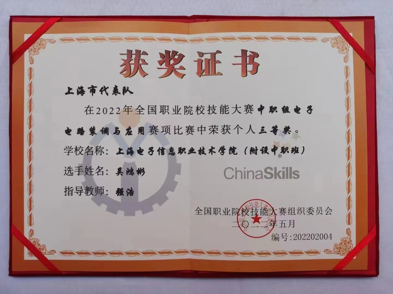 8月4日—5日,2022年全国职业院校技能大赛(中职组)“电子电路装调与应用”赛项在青海省西宁市青海交通职业技术学院举行,共有来自全国各省(自治区、直辖市)的64支代表队参赛。上海电子信息职业技术学院194应电2班吴鸿彬同学作为该赛项上海参赛选手之一,他奋勇拼搏、追求卓越,最终取得了大赛三等奖的好成绩。