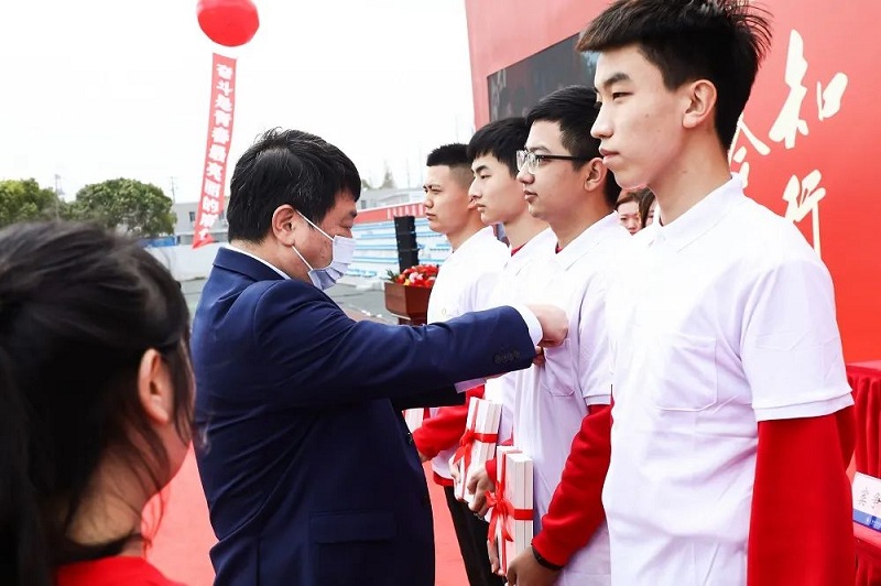 开学典礼还举行了赠送校徽和赠书仪式。学校党委书记田钦为2022级新生代表逐一授发校徽。2000余名新生,同步在现场佩戴校徽。校徽佩戴于胸,其蕴含的学校精神内化于心,标志着2022级新生正式加入电子信息学院的大家庭,开启了技能报国、追求卓越的新征程。田钦书记还亲切地向同学们赠送书籍《习近平讲故事》,希望同学们认真阅读,感受书中展现的深厚人文情怀和哲学底蕴,努力成为堪当民族复兴重任的时代新人。