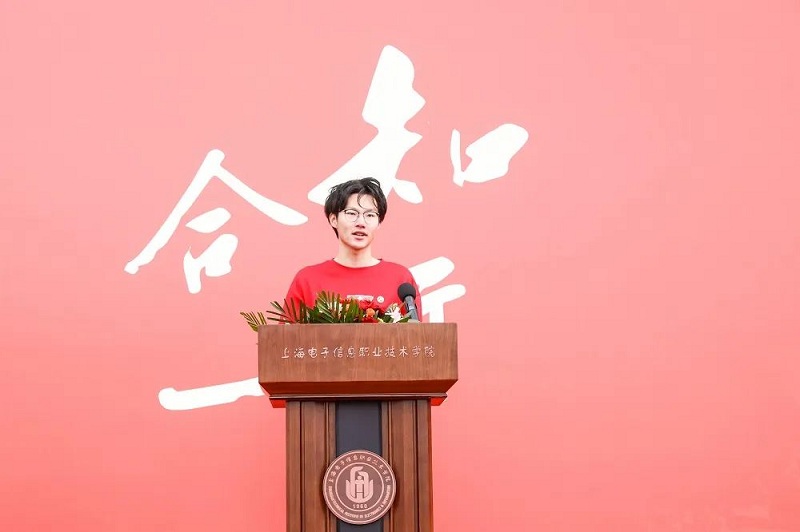 电子技术与工程学院卢克作为2022级新生代表发言。他说到:“当怀着忐忑、憧憬、梦想踏入学校,感受到了学校欣欣向荣、朝气蓬勃的气息。在疫情这个特殊的时期,学校各项工作的精细安排、井然有序,温暖地守护了每一位学生。”他号召同学们将喻理求真的行动实践于身,努力成为一名合格的新时代大国工匠。