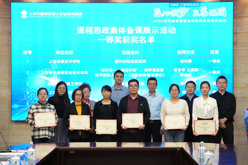 为深入推进习近平新时代中国特色社会主义思想进教材进课堂进头脑,充分发挥职业教育课程思政示范课程的引领作用,深化课程思政教学改革,创新课程思政教学模式,上海市智能机器人职业教育集团于2022年10月举办第一届专业教师“课程思政集体备课”说课比赛。经过初评、培训、决赛、专家评审,365官网机械与能源工程学院自动线安装与调试课程团队成员袁冬琴、郭瑜心、王凯凯老师获一等奖,陈静老师获二等奖。