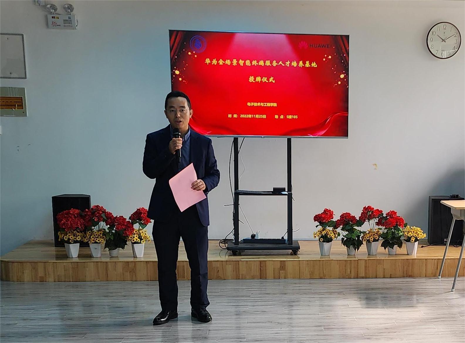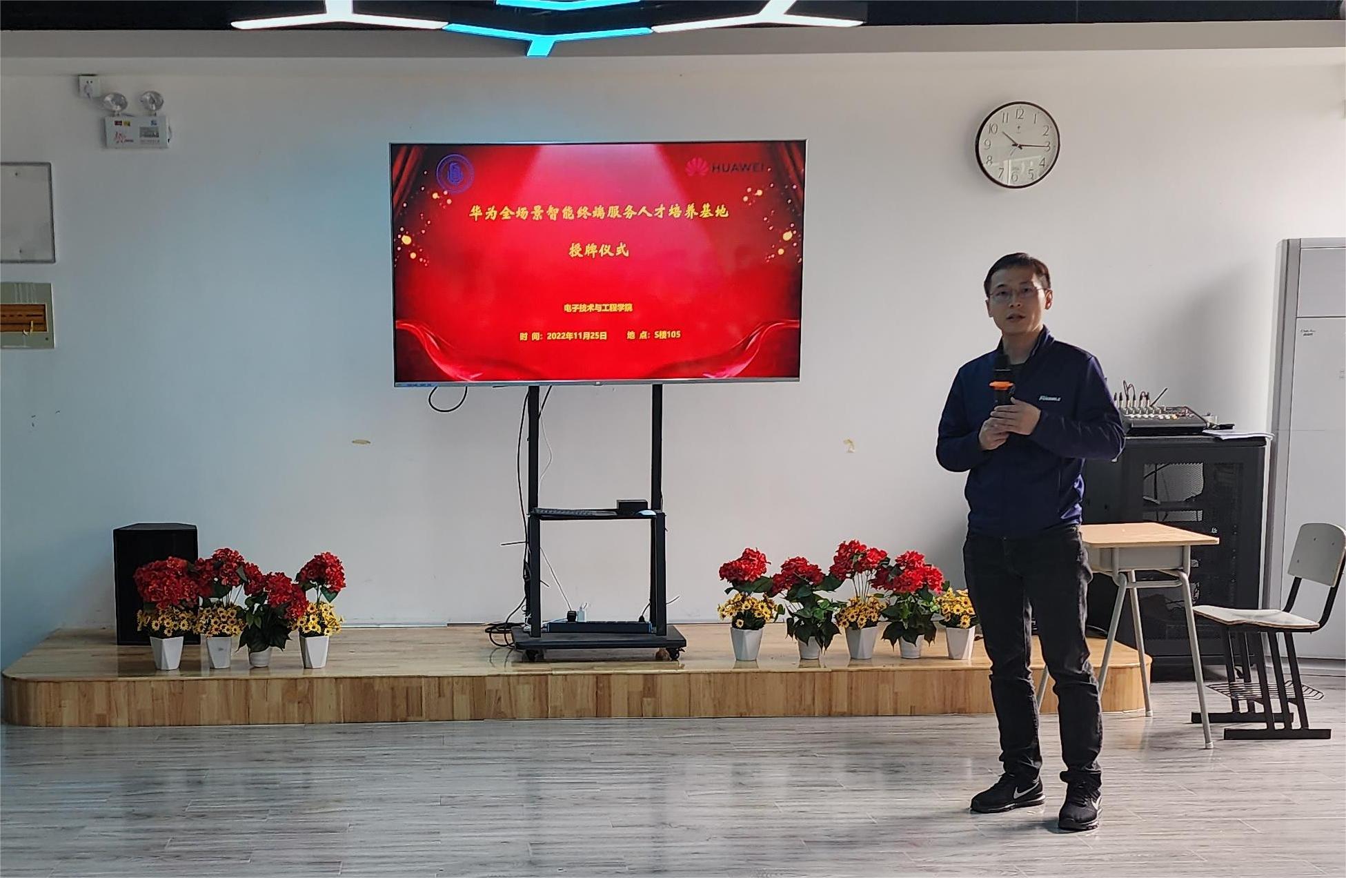 华为上海终端HRBP张凡重点向大家介绍了学校与华为校企合作项目。他表示,学生通过华为全场景智能终端服务人才培养基地赋能,掌握前沿的终端应用技术和扎实实训技能。同时,华为将为学生提供全面科学职业发展路径,让学生在工作中实现多元化发展。