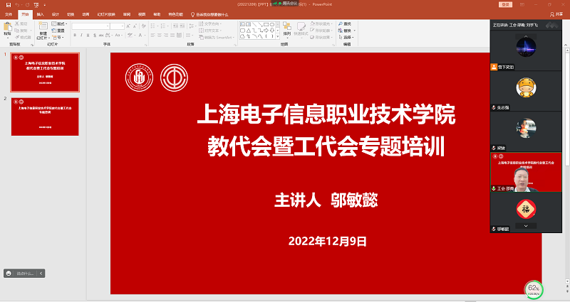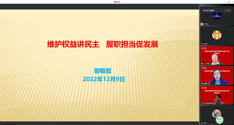 为高质量开好学校教代会暨工代会(以下简称“双代会”),提高代表履职能力,12月9日下午,校工会在线上举办教代会暨工代会培训。学校党委副书记、副院长、工会主席张涛出席,上海立信会计金融学院原党委组织部部长、工会常务副主席邬敏懿作专题培训。二级学院党政领导、工会全委会、二级工会主席、第四届双代会代表参加。培训由校工会常务副主席邵菁主持。