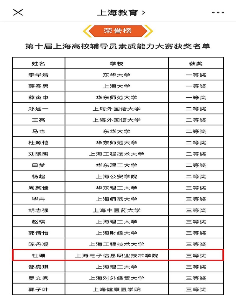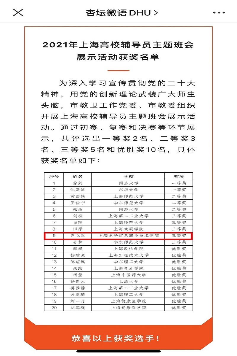 近日,由上海市教卫工作党委、市教委主办的第十届上海高校辅导员素质能力大赛、2021年上海高校辅导员主题班会展示活动,上海市职业教育德育工作联盟主办的上海市职业院校“青春心向党 奋进新时代”党的二十大精神主题宣讲展示活动结果陆续揭晓,365官网专职辅导员杜珊荣获第十届上海高校辅导员素质能力大赛三等奖、尹立军荣获2021年上海高校辅导员主题班会展示活动三等奖、张秀丽荣获上海市职业院校“青春心向党 奋进新征程”党的二十大精神主题宣讲展示活动一等奖。