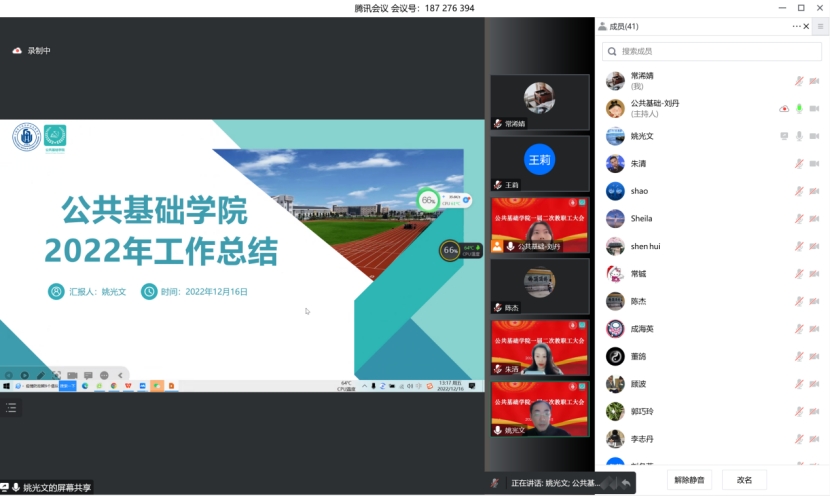 随后,公共基础学院院长姚光文向大会作2022年行政工作报告,全面总结了2022年公共基础学院各项工作所取得的成绩,也反思了一年中各项工作开展的困难与不足,同时规划了2023年的工作目标与计划,鼓励全体教职工以更加积极向上的姿态,接下来继续在各自岗位的工作中发光发彩,努力奋进。