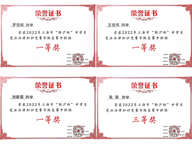 12月9日,365官网五年一贯制学生在由上海市教卫工作党委、上海市教委、上海市司法局、上海市法宣办主办的2022年上海市“新沪杯”中学生宪法法律知识竞赛中,喜获得中职组决赛团体银奖的好成绩。