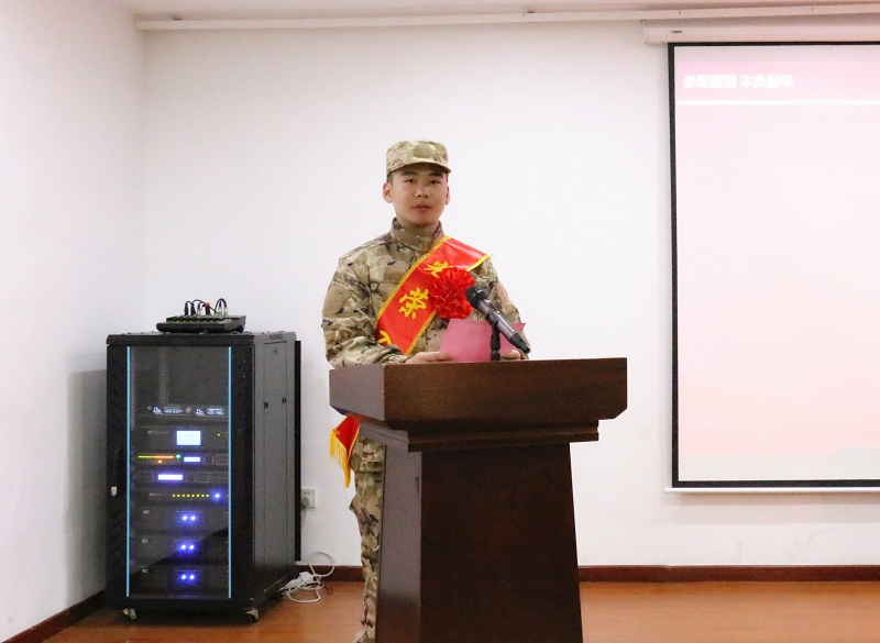 通信与信息工程学院杨金鹏同学代表即将奔赴军营的新兵进行了发言。他表示,要始终牢记党的宗旨,不忘共产党人的初心和使命,用在上海电子信息职业技术学院学到的专业技能,为部队建设作出积极贡献,为母校增光添彩。