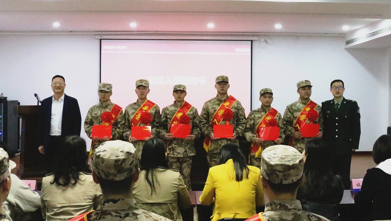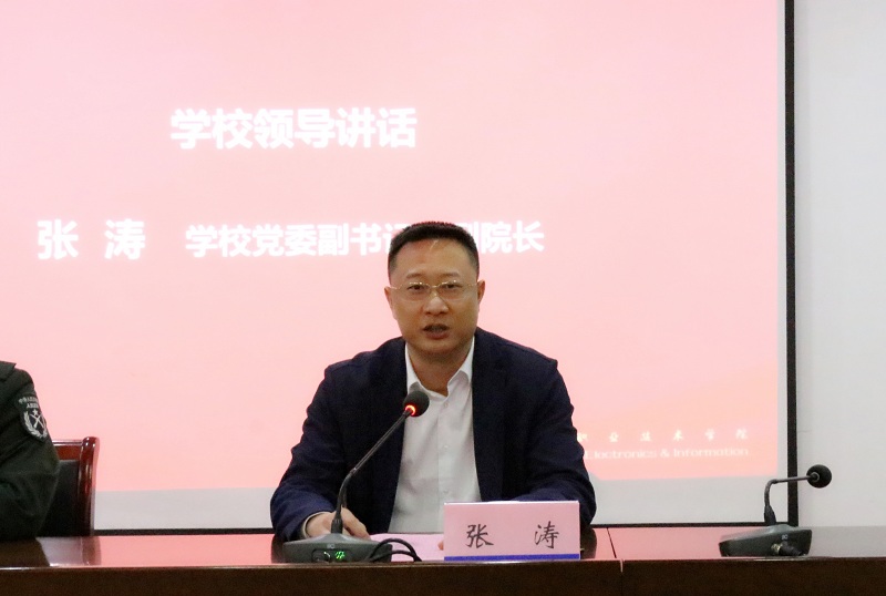 学校党委副书记、副院长张涛发表工作讲话。他首先向同学们携笔从戎的爱国情、报国志致以崇高敬意,并代表学校党委对即将步入军营的新兵们提出了三点希望:一是传承红色基因,坚定理想信念。叮嘱同学们要坚持用习近平新时代中国特色社会主义思想和习近平强军思想武装头脑,以“国家富强、民族振兴”为己任,瞄准“听党指挥、能打胜仗、作风优良”的强军目标,把热血挥洒在实现强军梦的伟大实践中。二是锻造过硬本领、献身国防建设。希望同学们牢牢把握当兵锻炼的机会,勤学军事知识、苦练打赢本领,为实现中国梦、强军梦贡献更多智慧、更多力量。三是勇于建功立业、为校争光添彩。希望同学们秉承电子信息学院“尚德修能、知行合一”的校训精神,扎根军营、练就本领,坚守初心使命,强化斗争精神,勇于攻坚克难,将爱国之情、强国之心体现到一言一行上。
