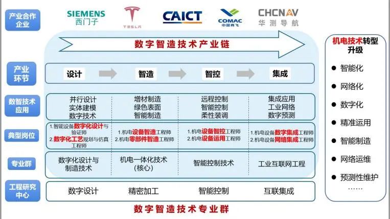 中德合作数字智造技术专业群,对接上海三大先导产业和六大产业集群的数字智造技术产业链,契合上海临港所需的“设计、智造、智控、集成”岗位群,以数字智造技术应用为主线,以机电一体化技术(中德合作)(智造)为核心,工业互联网工程(集成)为骨干,数字化设计与制造技术(设计)和智能控制技术(智控)为支撑,构建对接产业、提供人才和技术支撑的专业群。
