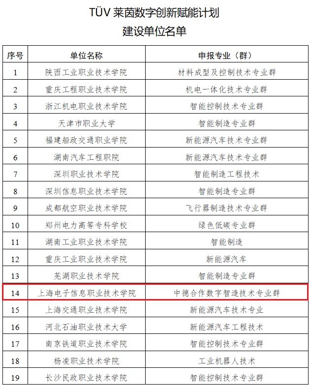 “TÜV莱茵数字创新赋能计划”是在教育部指导下,由中国教育国际交流协会联合德国TÜV莱茵集团共同开展的产教融合创新试点项目。该计划聚焦智能制造、新能源汽车、绿色低碳三个专业领域,以创新性“企业服务—人才赋能—院校赋能”产教融合模式,对标数字化转型背景下国际产业标准和人才培养标准,助力职业院校增强“双师型”教师素质,提升数字化综合治理水平,研制国际通用的专业标准,提高人才培养的能力和水平,推进校企协同创新和成果转化。