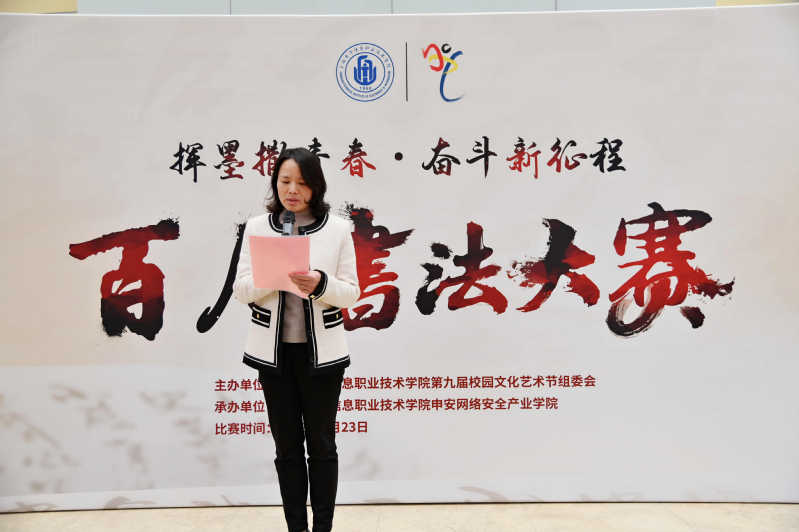 2023年4月23日中午,由申安网络安全产业学院承办的第九届校园文化艺术节“挥墨洒青春,奋斗新征程”书法大赛在图书馆举行。学校党委副书记、副院长张涛、校团委负责人、申安网络安全产业学院负责人以及各二级学院学生工作负责人、团总支负责人莅临赛场。来自各二级学院的硬笔书法选手60人、软笔书法选手40人参赛。申安网络安全产业学院直属党支部书记、院长何永艳作比赛开幕式致辞。