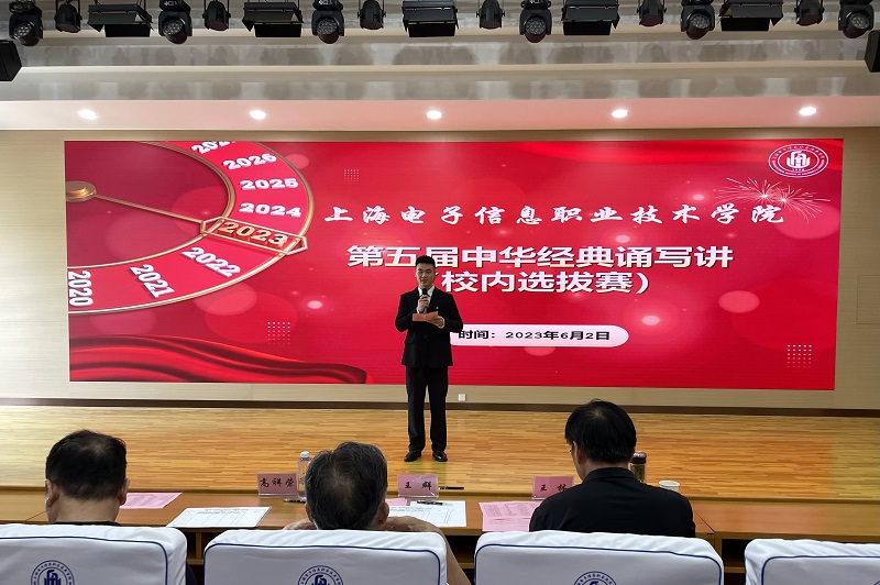 诵读国学经典,彰显华夏文明。为贯彻落实党的二十大精神,加大国家通用语言文字推广力度,全面深入实施中华经典诵读工程和“典耀中华”主题读书活动,6月2日,学校在C108报告厅举办“书香新时代,‘典’亮新征程”学校第五届经典诵写讲比赛。华东师范大学传播学院教授、博导王群老师,上海师范大学影视传媒学院教授、播音主持艺术专业主任高祥荣老师,上海市闵行区教育学院中学语文教研员、上海市语文特级教师、正高级教师、上海师范大学特聘教授王林老师应邀担任此次大赛的专家评委。