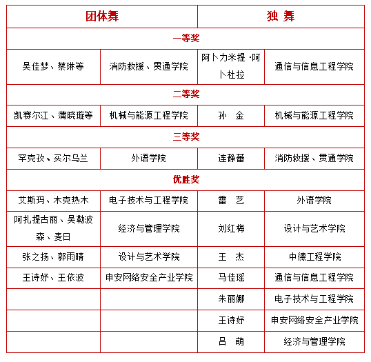 经过各二级学院的初赛筛选,有10支独舞和7支团体舞进入决赛环节。开场舞《Faded》科技与舞蹈的完美融合,让人耳目一新,大赛正式启幕。大赛分为“国风雅韵”“律动青春”“凝心聚力”“逐梦未来”四个篇章,舞蹈形式丰富多彩,有舒展典雅的中国舞,有风情浓郁的民族舞,还有活力四射的现代舞。学校健身社的风采展示,秀出青春不一样的风采,为本次大赛画上圆满句号。经过评委公平、公开、公正地打分,分别评出团体舞和独舞的奖项。(详见获奖名单)