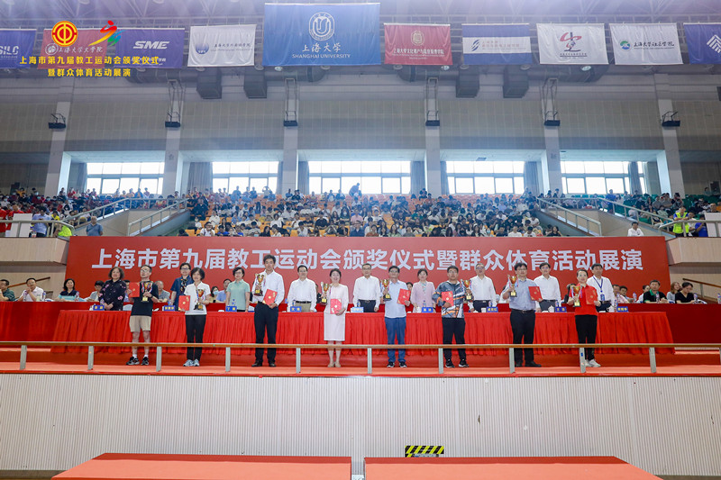 2023年6月18日,由上海市教卫工作党委、上海市教委、上海市教育工会主办、上海大学承办的上海市第九届教工运动会颁奖仪式暨群众体育活动展演在上海大学宝山校区隆重举行。学校党委副书记、副院长、工会主席张涛应邀参加,365官网10名教职工代表参加了闭幕式广播操展演。