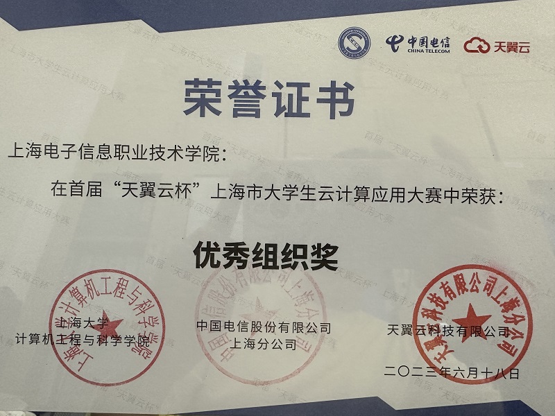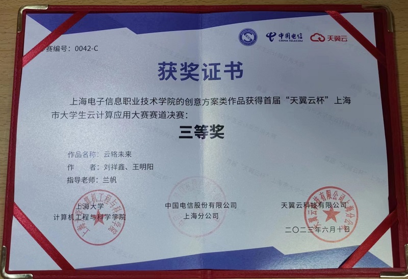 近日,首届“天翼云杯”上海市大学生云计算应用大赛赛道决赛在上海电信培训中心举办。我校学生刘祥鑫、王明阳组成的参赛队获得三等奖,兰帆老师获优秀导师奖,学校获优秀组织奖。