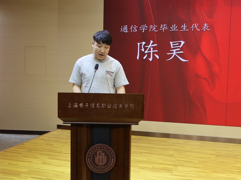 毕业生代表陈昊真挚地感谢学校老师三年的关怀和培养,从一点一滴、一处一景中回顾了在电子信息求学的美好时光,三年的成长与磨砺、温暖与感动,铸就了美好的青春之梦。