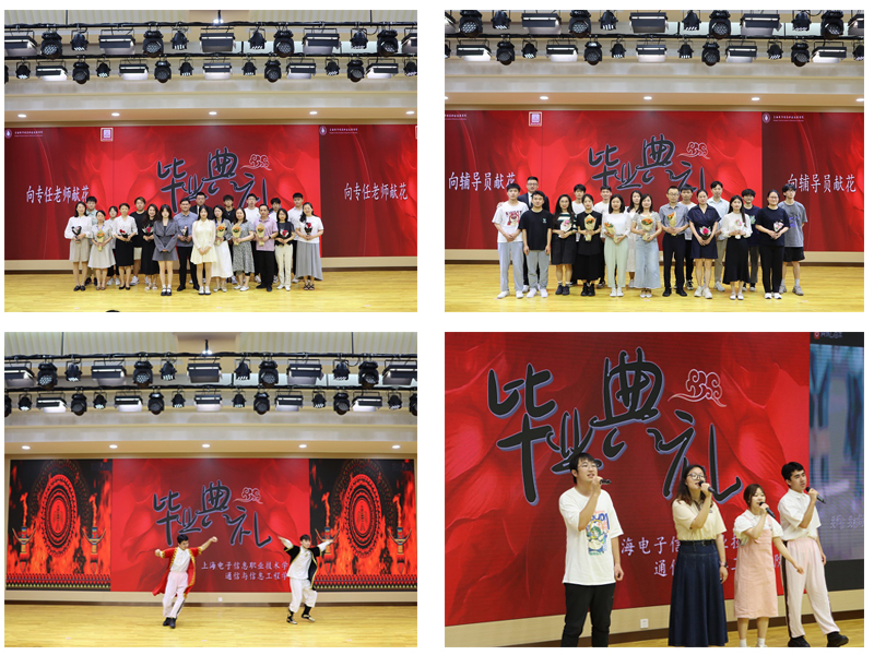 学校党委书记田钦、通信学院负责人先后为上海市及学校优秀毕业生颁发荣誉证书。毕业生代表向辛勤付出的老师代表送上鲜花以示感谢。学弟学妹们用激昂的歌声、优美的舞蹈送别临行的学长学姐。