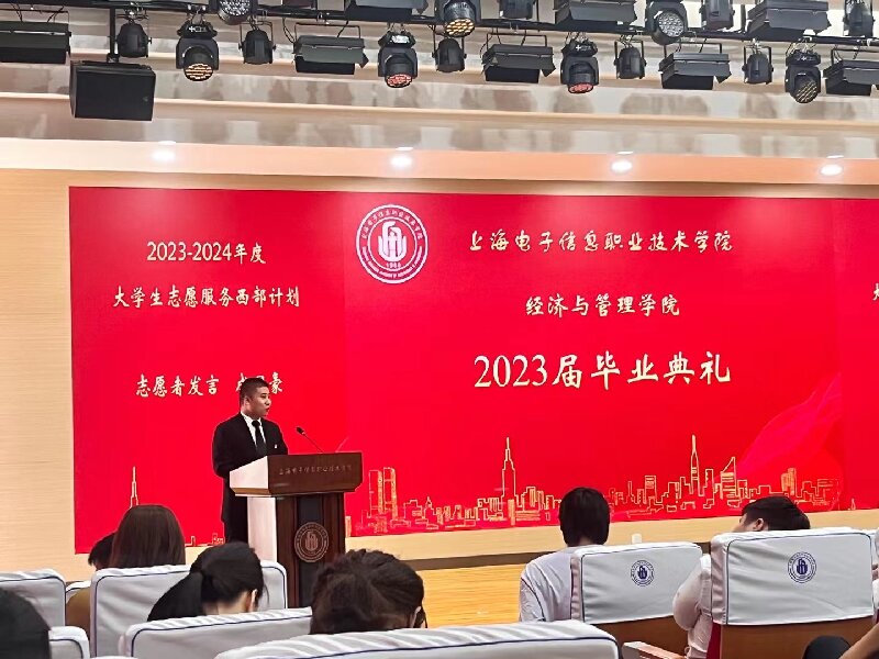 另一位毕业生代表成国豪同学在发言中介绍了他成为“2023-2024年度大学生志愿服务西部计划志愿者”的亲身经历。他表示,要到基层去、到祖国最需要的地方去,要将自身专业知识应用到实际工作中,保持谦逊好学的态度,在未来岗位上发光发热;以实际行动彰显电子信息学子的担当与使命,真诚奉献,笃信砺志,在西部的大课堂中不断成长。以“小我”融入“大我”,抒写不一样的热血芳华。