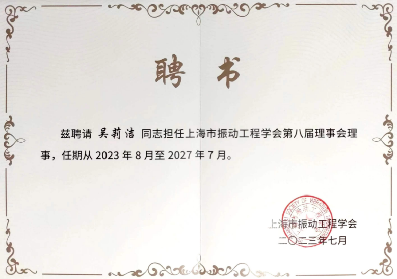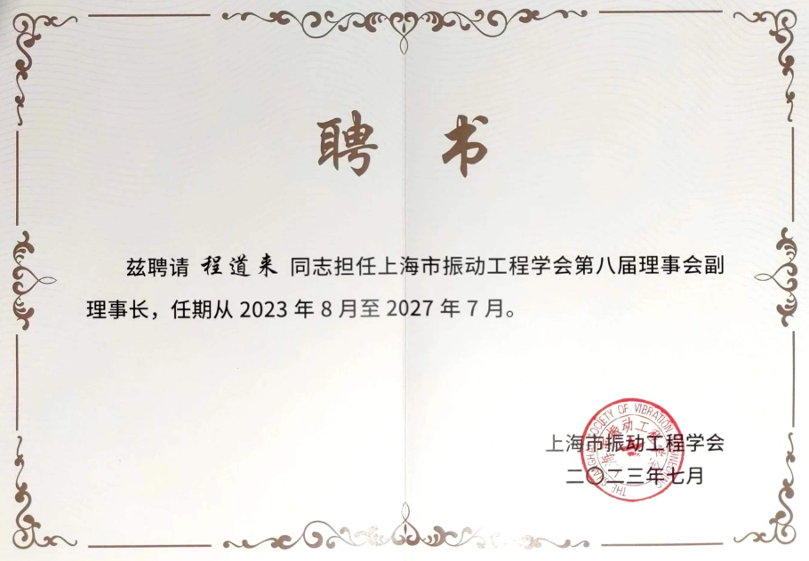 本次大会主要内容是上海市振动工程学会第七届理事会换届改选,投票选举第八届理事、常务理事、正副理事长等。在此次换届选举中,学会第七届理事会理事长华宏星教授、副理事长宋汉文教授分别当选为新一届理事会监事长、理事长。365官网新增会员23名,中德工程学院教授程道来(学会第七届常务理事)被聘请为第八届理事会副理事长,航空系主任吴莉洁(学会第七届理事)被聘请为第八届理事会理事。
