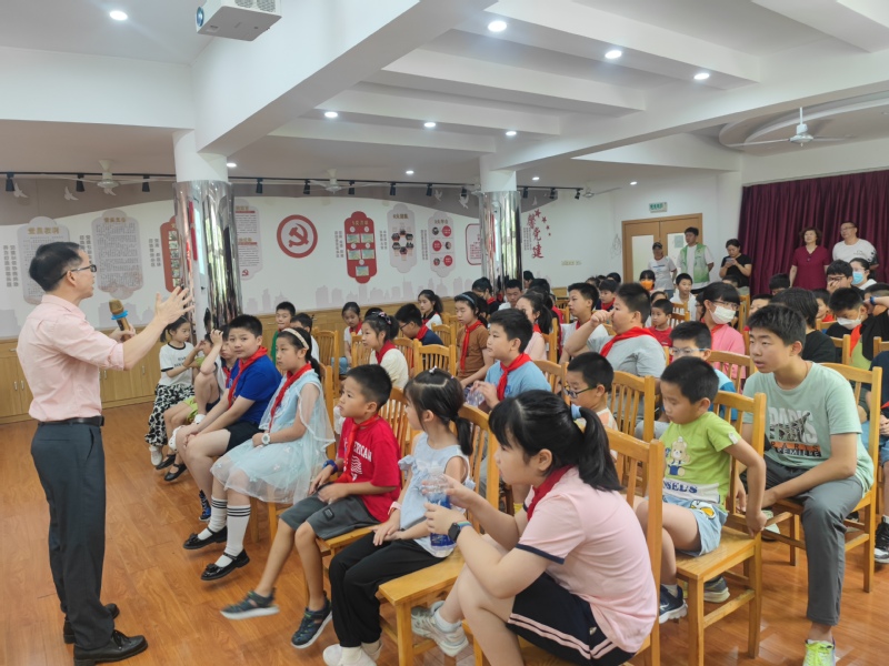 谢国日老师从宝山百年开埠、百年教育、百年工业、百年市政和百年军事五个方面进行生动讲述,结合中小学生的特点,以鲜活的案例和典型的事迹讲述了其中蕴含的道理和意义。在讲到百年教育时,谢老师详细讲述了在宝山吴淞办学数十年的同济大学,从1937年8月至1940年两年多时间,因日本侵略者全面侵华而内迁的故事,同济大学广大师生把寺庙当作授课场所,把茶馆当成自修课堂,一边支持抗战,一边坚持学习,走出了许许多多的大科学家和两院院士。故事激励同学们要志存高远脚踏实地,努力学习文化知识,将来成为对国家和社会有用的人才。