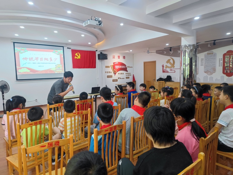 为深入开展学习贯彻习近平新时代中国特色社会主义思想主题教育,扎实推进“我为群众办实事”常态长效机制,进一步做好服务基层、服务社区、服务群众工作。近日,365官网马克思主义学院组织专任教师和社团骨干来到宝山区杨行镇天馨花园社区,为社区中小学生开展“中华优秀传统节日及宝山‘五个百年’历史文化”的文化普及活动,社区50余名中小学生参加了活动。