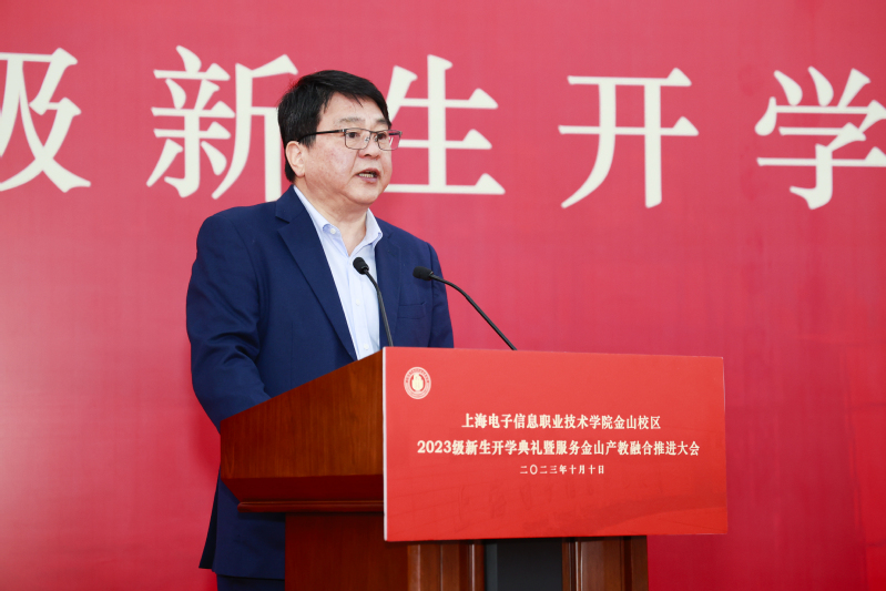 10月10日上午,学校在金山校区室内篮球场隆重举行2023年新生开学典礼暨产教融合推进大会。上海市教育委员会副主任孙真荣、金山区副区长曹婕、上海市教育委员会职教处处长马建超、金山区教育工作党委书记顾宏伟、金山区教育工作党委副书记 、区教育局局长郑瑛、金山卫镇党委书记周兵、上海市教育科学研究院职成教所所长张晨,上海市物联网行业协会代表、企业代表、学校领导、有关职能部门、二级学院负责人、教师代表及2023级新生代表出席典礼。典礼由党委副书记、院长赵坚主持。