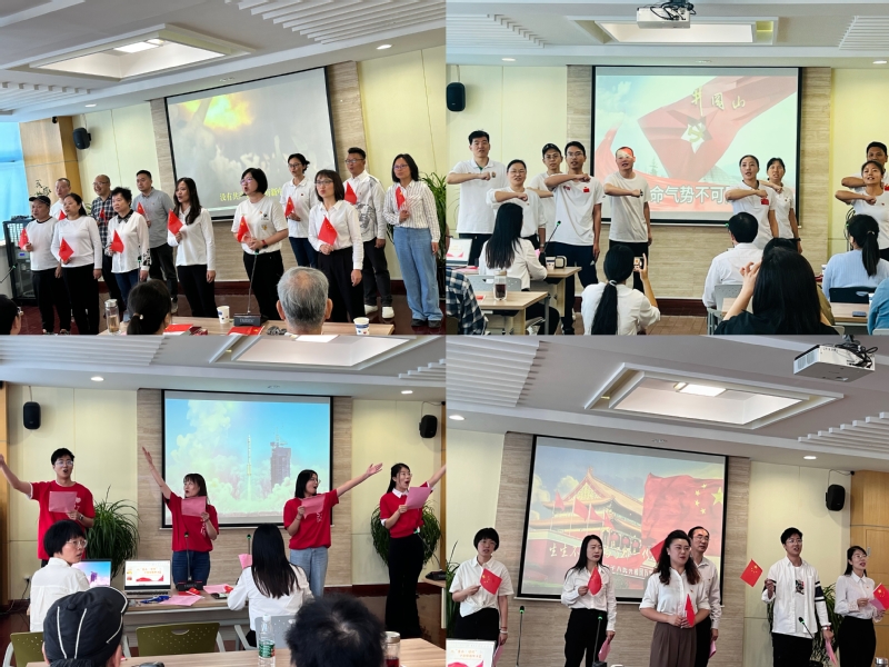 活动以百年党史为脉络,分为“峥嵘岁月”“日月新天”“领航时代”三个篇章。活动在《义勇军进行曲》中拉开帷幕,全体党员教师充满力量地唱出团结的力量和民族自豪感。接着,第一党小组的数学老师通过合唱《没有共产党就没有新中国》唱响了抗日战争时期亿万人民驱逐侵略者、建立新中国的壮志豪情。第一、第二党小组的体育、物理老师唱起热血沸腾、豪情满怀的歌曲《我们走在大路上》,受到了老师们的热烈欢迎和由衷喜爱。第一党小组的语文老师深情朗诵《盛世中国》,展现了新时代下教师凝心聚力、满怀信心走进新时代的风采。最后,学院办公室老师通过《不忘初心筑梦前行》的诗词和音乐传递能量,展现了学院教师不断向着新的目标破浪前进的勇气和决心。
