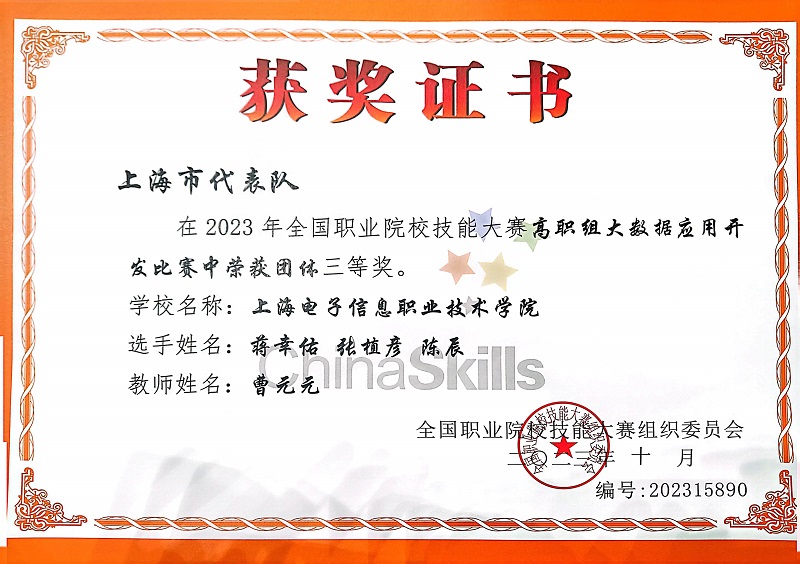 10月23日,2023年全国职业院校技能大赛大数据应用开发赛项在海南省琼海市南海博物馆举行。本次比赛采用师生同赛形式进行,365官网通信与信息工程学院教师曹元元和学生蒋幸佑、陈辰、张植彦组成的参赛队参加比赛,与来自全国64所高职院校参赛队同场竞技。经过一天紧张激烈的竞技,365官网参赛队获得三等奖。
