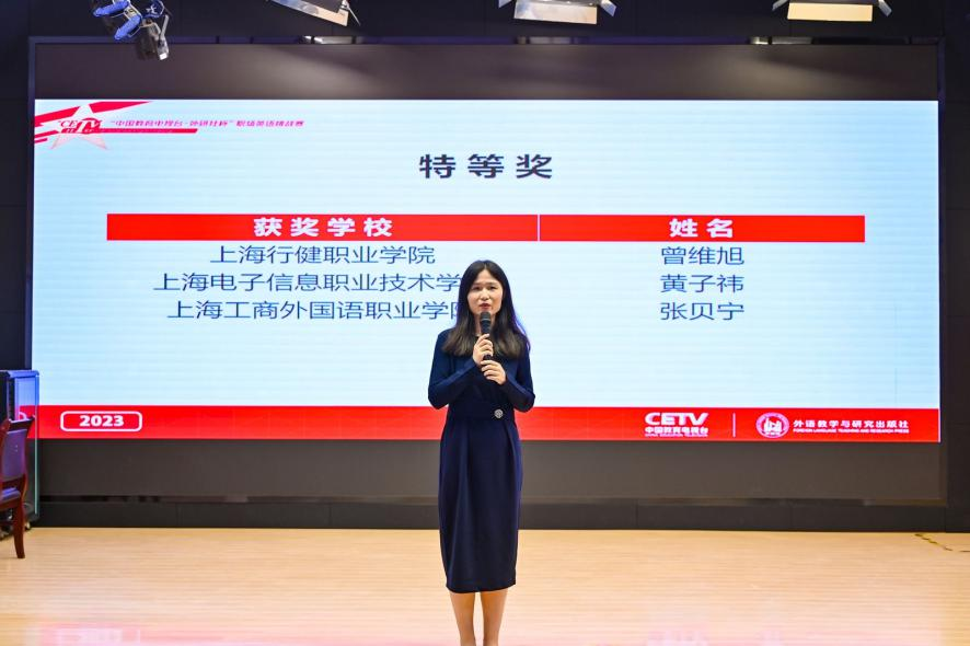 10月29日上午,2023年“中国教育电视台·外研社杯”职场英语挑战赛演讲大赛上海赛区决赛在上海电子信息职业技术学院成功举办。本次挑战赛由中国职业技术教育学会指导,中国教育电视台和外语教学与研究出版社联合主办,上海电子信息职业技术学院外语学院承办。大赛共有近20所高职院校学生参赛。经过激烈角逐,最终有来自13所院校的15名选手脱颖而出,晋级上海市决赛。365官网外语学院应用英语专业学生黄子祎在本次大赛中表现优异,斩获特等奖。