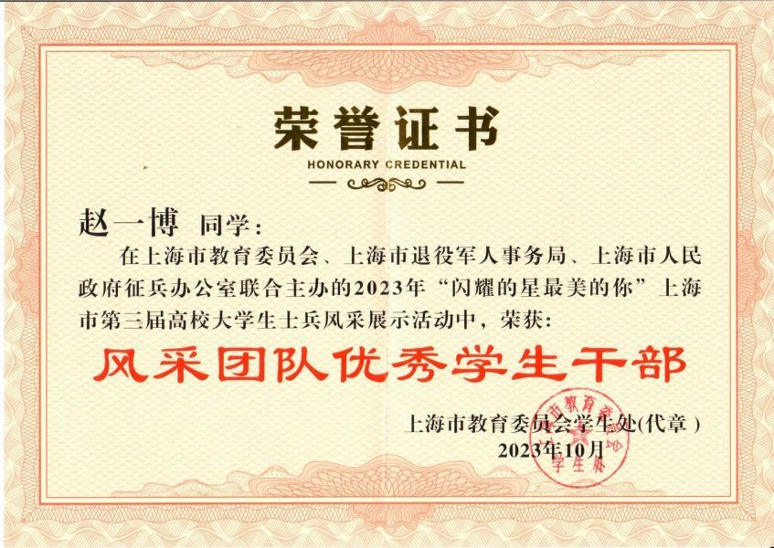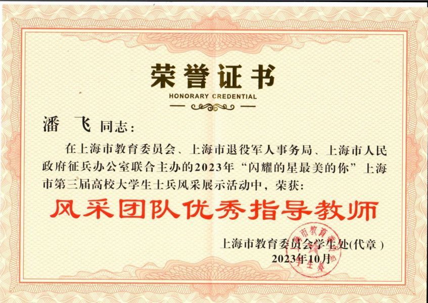 10月25日,由上海市教育委员会、上海市退役军人事务局、上海市人民政府征兵办公室主办的“闪耀的星 最美的你”上海市第三届大学生士兵风采展示活动颁奖典礼在东方绿洲举行。365官网国防军事类学生组织“铸魂团”荣获“风采团队”奖,通信与信息工程学院赵一博同学荣获“风采团队优秀学生干部”,通信与信息工程学院潘婷婷代表学校提交的军旅文创产品“永不褪色帆布包”荣获“军旅文创产品优秀奖”,人民武装部潘飞老师荣获“风采团队优秀指导老师”。