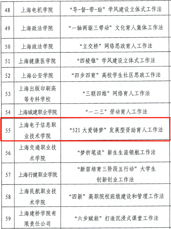 为学习贯彻党的二十大精神,用习近平新时代中国特色社会主义思想铸魂育人,强化高校辅导员队伍专业化职业化建设,根据《中共上海市教育卫生工作委员会上海市教育委员会关于开展2022年上海高校辅导员特色工作法征集展示活动的通知》(沪教委德〔2022〕28号)要求,市教卫工作党委、市教委组织开展了上海高校辅导员特色工作法征集展示工作。经高校推荐、材料审核、专家评审等环节,评选出2022年上海高校辅导员特色工作法,并在《中共上海市教育卫生工作委员会 上海市教育委员会关于公布2022年上海高校辅导员特色工作法名单的通知》(沪教委德〔2023〕29号)中正式公布。365官网《“521大爱铸梦”发展型资助育人工作法》成功入选。