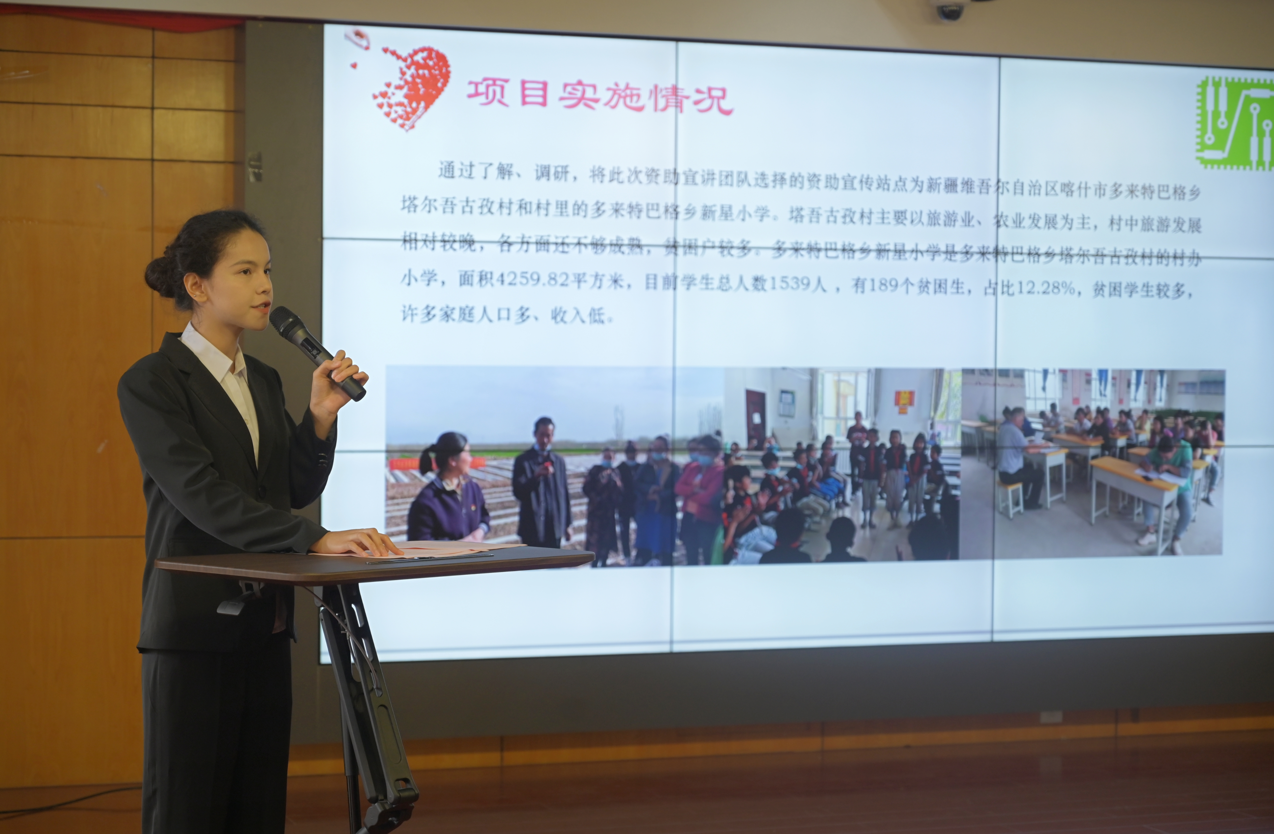 随后,《爱心点亮微光,资助助力飞翔》资助宣传大使项目负责人艾斯玛·乌买尔江进行了项目总结展示。2023年暑假,我院资助宣讲团队深入新疆多来特巴格乡塔尔吾古孜村和小学,通过“三暖”行动,即温暖困难生活、温暖困难心灵、温暖困难成才路,将学校宣传、家庭宣传、社会宣传相结合,开展多层次、多方位、多形式的资助宣传活动。这次活动让新疆多来特巴格乡塔尔吾古孜村贫困家庭、学生了解认识国家促进教育公平、办好让人民满意的教育的决心和举措,提高对国家资助政策的认识,让每个贫困家庭、学生的上学梦不因经济而阻断,切实通过教育和帮扶阻断贫困的代际传递,让国家大爱、学校温暖与新疆学子逐梦同行。