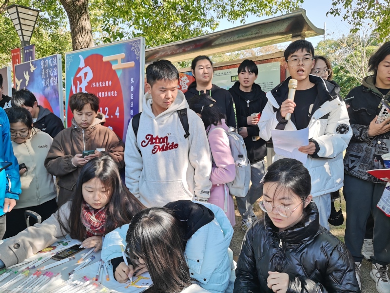 为全面深入学习宣传宪法,弘扬宪法精神,维护宪法权威,增强大学生法治意识,推动文明校园建设。在第十个国家宪法日到来之际,由校团委、马克思主义学院主办,马克思主义学院思想道德与法治教研部、文思木铎社、日新思辨社联合承办的“宪法我来讲”校园行活动顺利举行。思想道德与法治教研部主任荆筱槐、社团指导老师谢国日、刘蔚以及数百名师生在现场参加了活动。活动由文思木铎社社长杨廷东主持。