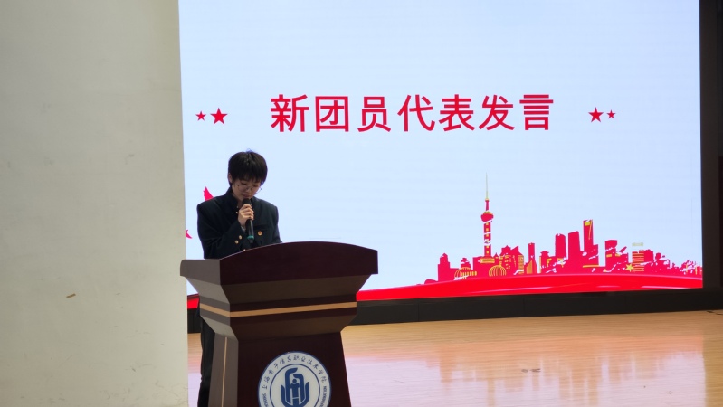 上海市奖学金获得者申田同学代表新团员发言,她说:“成为共青团员,不仅光荣,更意味着责任,我们要肩负起民族复兴的重任,坚定信念,勇往直前,为梦想而奋斗”。