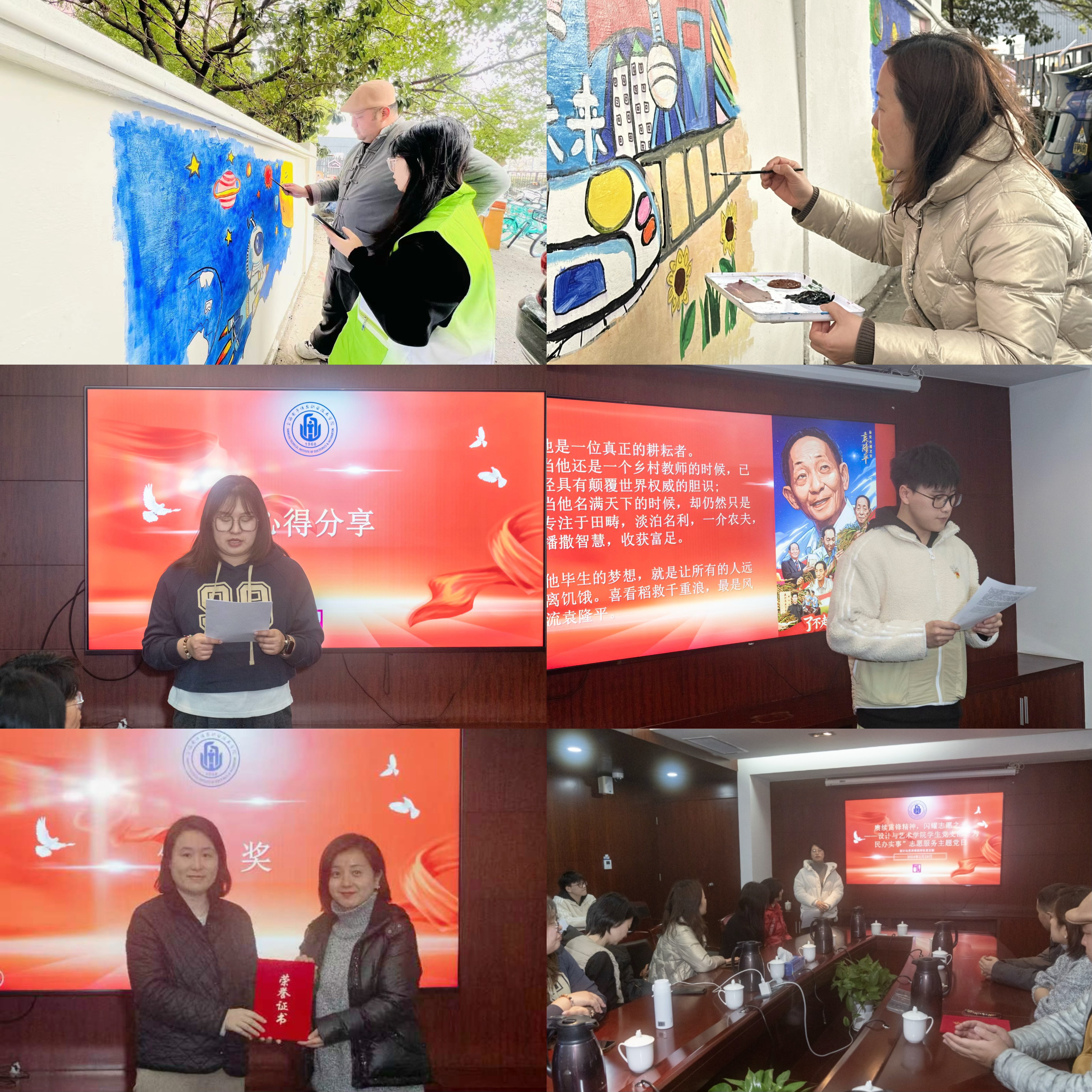 为深入开展学习贯彻习近平新时代中国特色社会主义思想主题教育,全面学习宣传贯彻党的二十大精神,发扬党员为民服务志愿服务精神及我院艺术设计专业特色,寒假期间,在设计与艺术学院党总支的指导下,学生党支部于普陀区甘泉路街道为街道新打造的“青立方”进行“为民办实事”墙绘志愿服务活动,墙绘内容为甘泉路街道幼儿园小朋友的科普画作,起到为社区居民科普宣传的作用。在此活动基础之上学生党支部于2月29日开展“赓续雷锋精神,闪耀志愿之光”党日活动。设艺学院学生党支部全体党员参加本次活动。