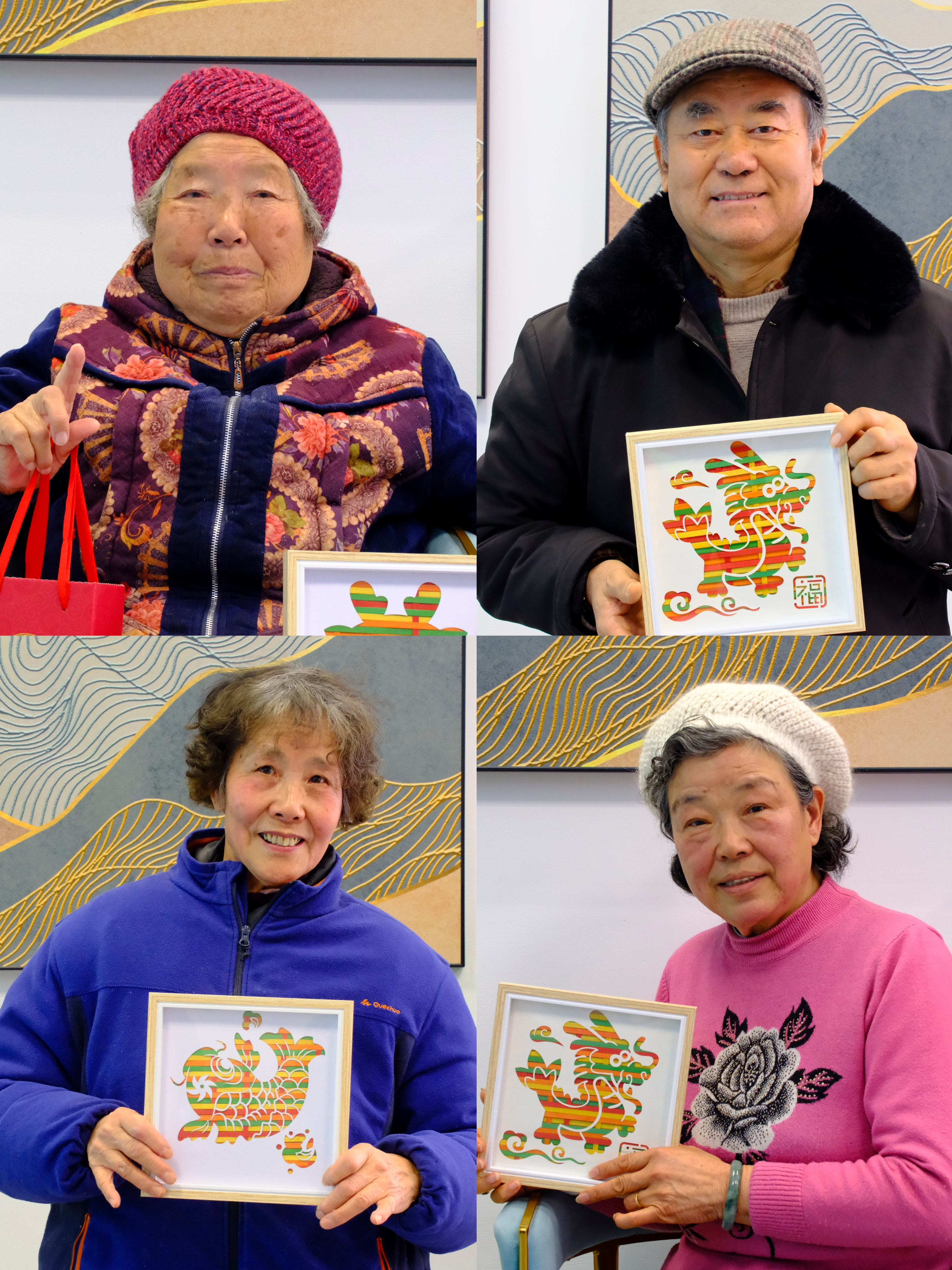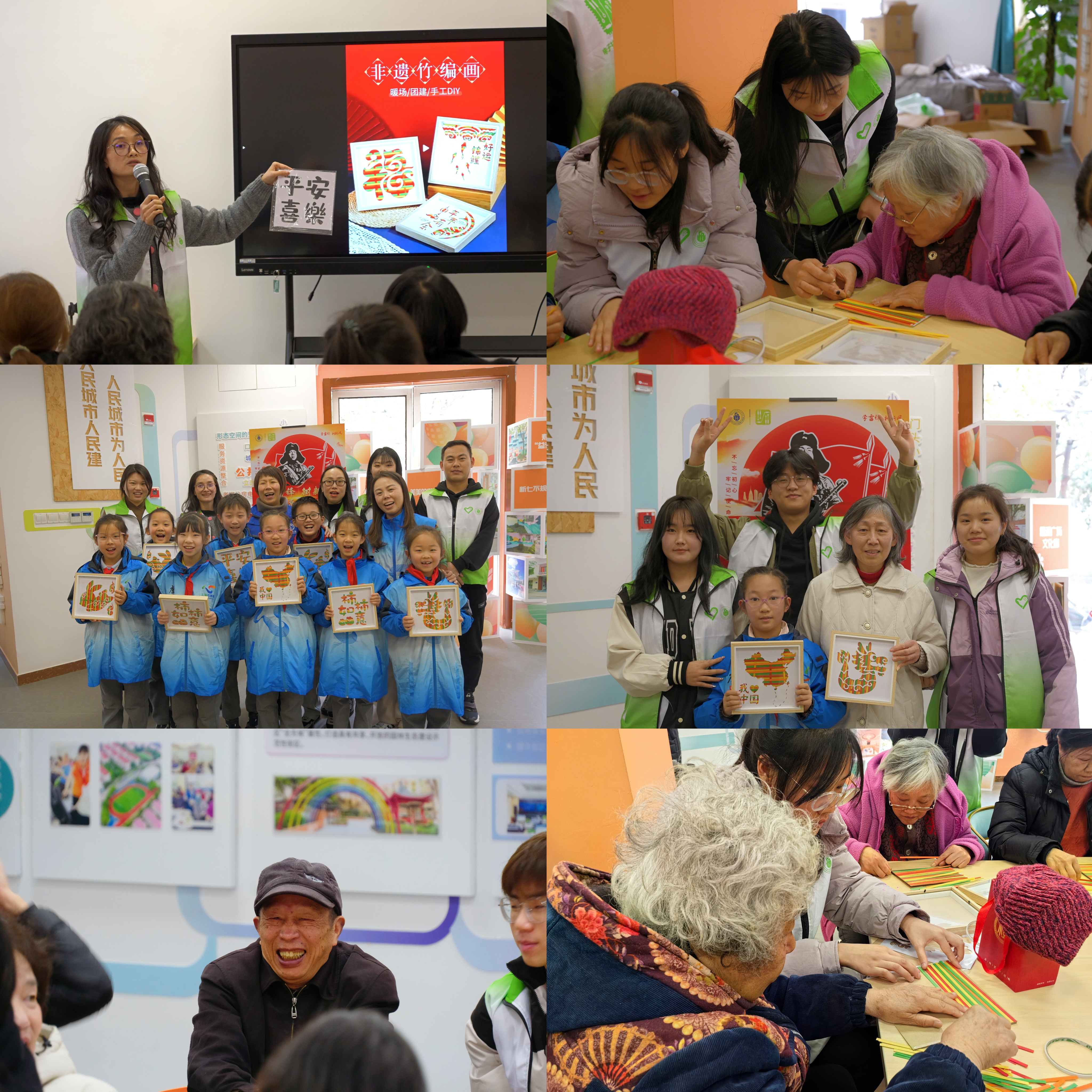 张竹、杜珊、聂博老师带领学生给老人和上海师范大学第一附属小学的小学生讲解非遗竹编的历史及本次龙年主题竹编的制作步骤,让老人和小朋友们在竹编的制作中感受非遗文化和对生活的美好向往。
