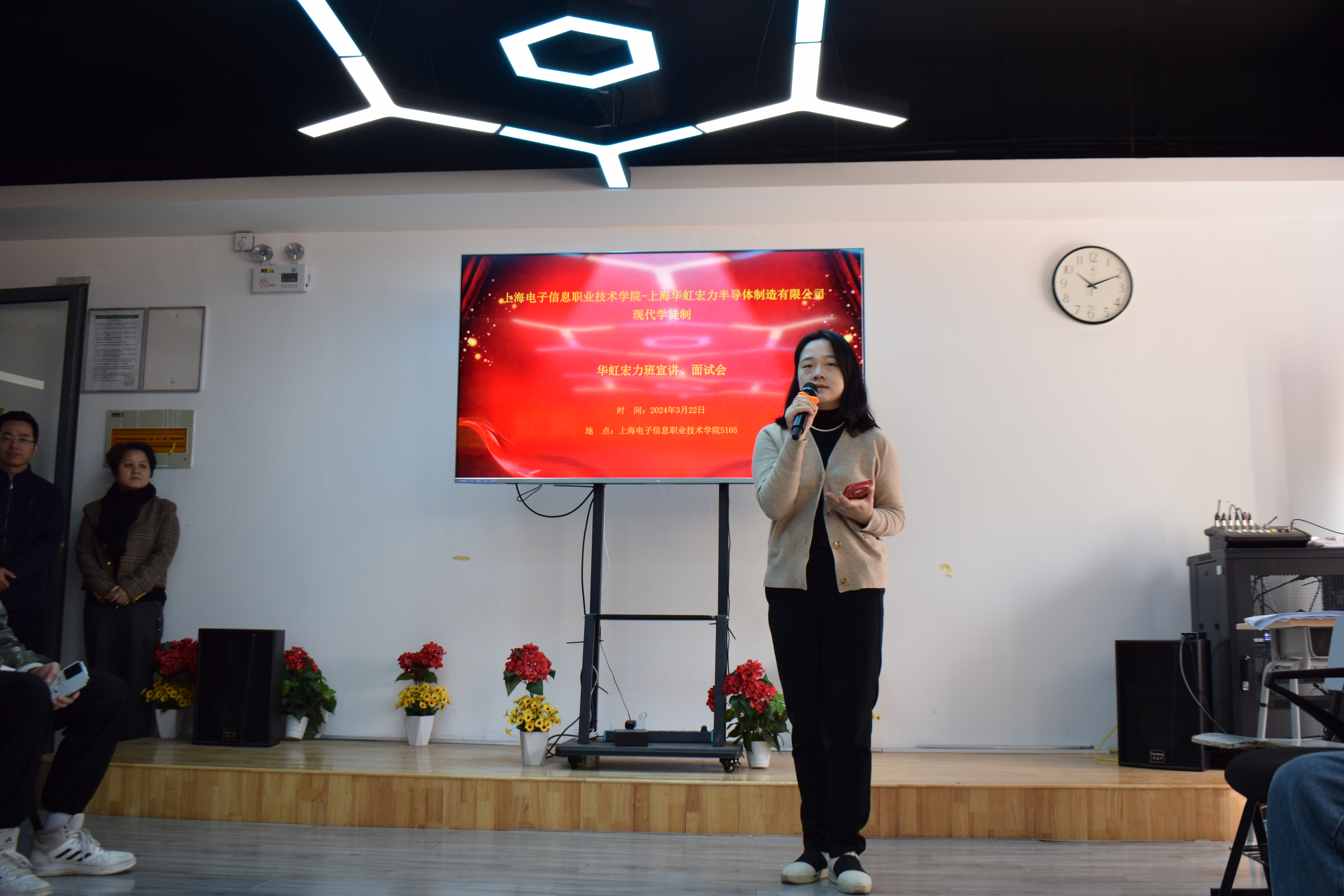 此次活动吸引了100多名2022级学生参加,展现出学生们对未来事业发展的浓厚兴趣。在宣讲会开始时,赵坚发表了热情洋溢的致辞,勉励同学们要从一线做起,扎实基础,稳步提升,为自己未来奠定坚实基础。随后,企业人事主管精彩介绍了行业和公司的基本信息,让同学们更深入地了解了电子信息行业的发展前景以及上海华虹宏力半导体制造有限公司的背景和优势。紧接着,企业技术主管为同学们详细介绍了岗位的基本信息,并耐心解答了同学们的疑问。学生们受益匪浅,纷纷表示对这样的学习与就业机会倍感期待。