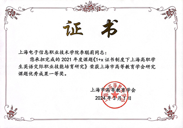 3月16日,上海市高等教育学会2024年学术年会在同济大学隆重召开。365官网外语学院教师李聪莉承担完成的2021年度课题《1+x证书制度下上海高职学生英语交际职业技能培育研究》荣获上海市高等教育学会研究课题优秀成果一等奖。