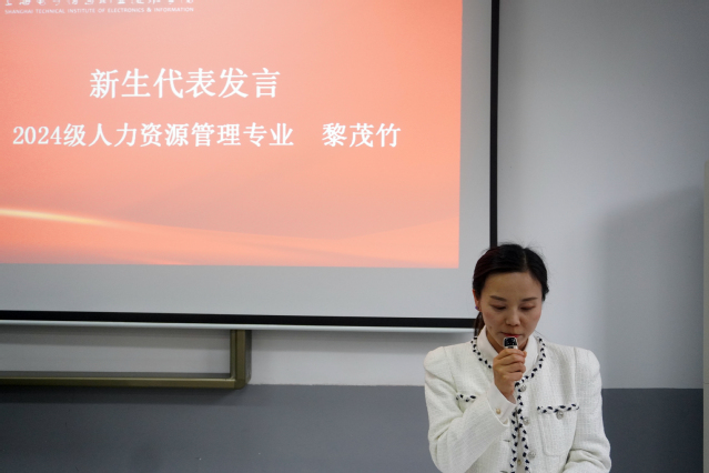2024级人力资源管理专业黎茂竹同学代表新生表达了对大学生活的憧憬和期待,作为新生,在今后学习中要正确处理好工作与学习之间的矛盾,做好角色转换。