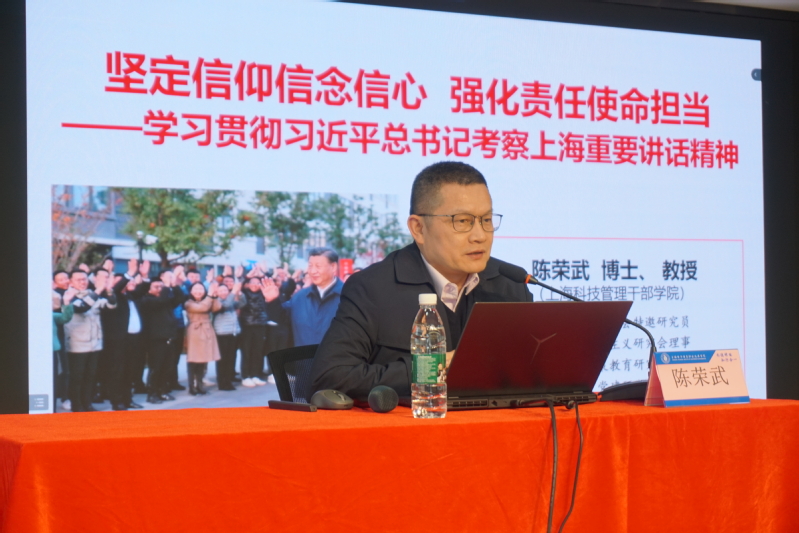 上海市党建研究会特邀研究员上海市马克思主义研究会理事、上海市形势政策教育研究会副会长、上海交通大学党史党建研究中心特聘研究员陈荣武博士、教授应邀来校作《坚定信仰信念信心 强化责任使命担当——学习贯彻习近平总书记考察上海重要讲话精神》主题宣讲。
