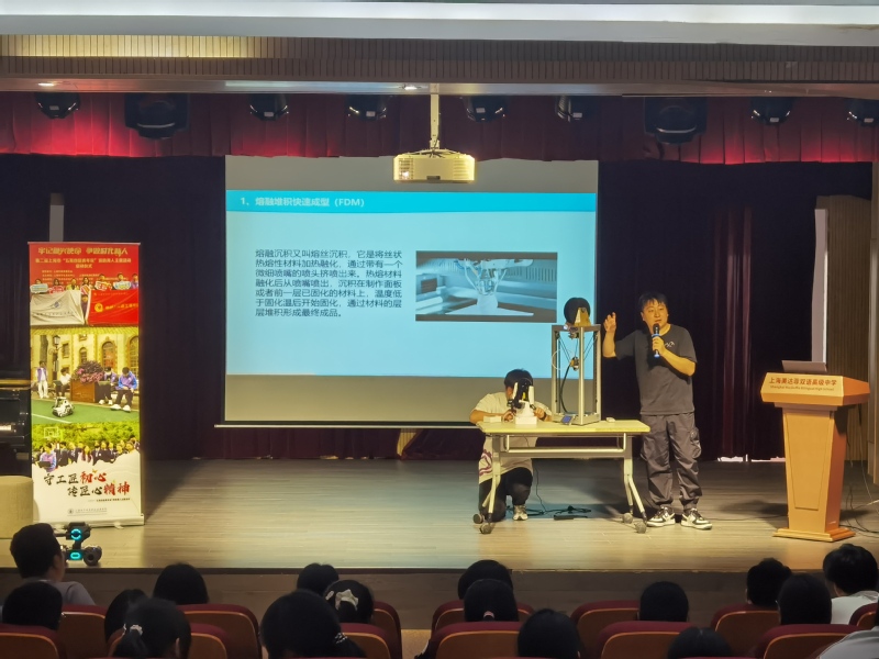 活动中,宣讲团成员蒲晓璇分享了她从家乡新疆到上海求学的经历,赵一凡分享了自己的大学生活,激励了在场学生。宣讲团老师马海洋则为学生们带来了一场关于智能制造技术的讲座。他详细讲解了机甲战车的操作与控制、机械臂控制方法以及3D打印项目实践,让学生们了解了智能制造技术的基本原理和实际应用。通过现场操作演示,学生们直观地感受到了智能制造的魅力,对科技的力量有了更深刻的认识。