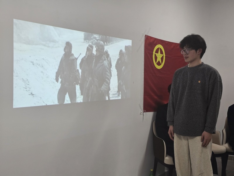 活动上,负责人孟泽彬同学以“红色历史与青年使命”为题作开场致辞。他阐述了本次活动的核心意义,表示红色基因是共青团的精神血脉,号召新时代青年从革命历史中汲取力量,将爱国之情、报国之志转化为日常学习与工作的实际行动,为本次活动拉开了庄严而温暖的序幕。