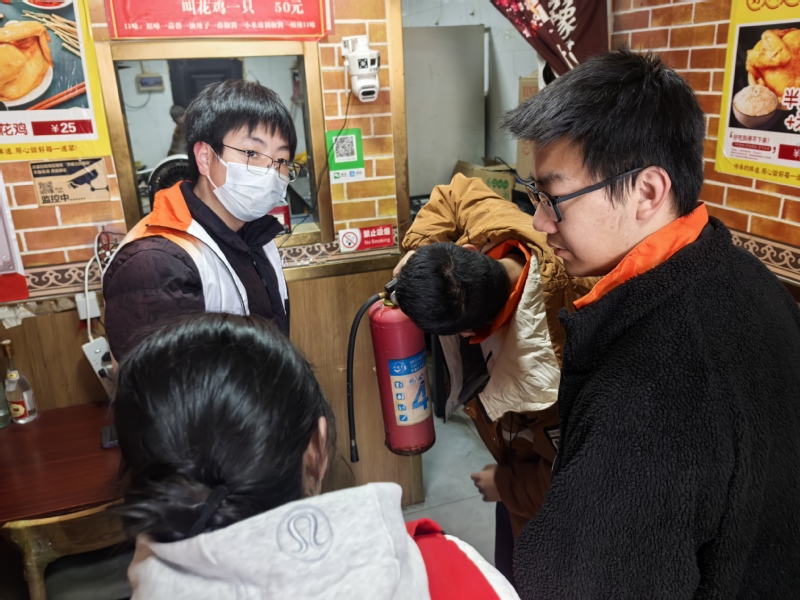 与此同时,消防安全检查小组的志愿者们以“专业严谨”为标准,逐一走访社区沿街商铺。他们重点检查了各商铺内灭火器是否完好有效、压力是否处于正常范围、是否按要求定期开展巡检等关键环节,并现场向店主普及消防安全注意事项,耐心讲解灭火器正确使用方法,将课堂所学专业知识转化为服务群众的实际能力。志愿者们以认真负责的态度和扎实的专业素养,得到了社区工作人员、商铺经营者及居民的认可。