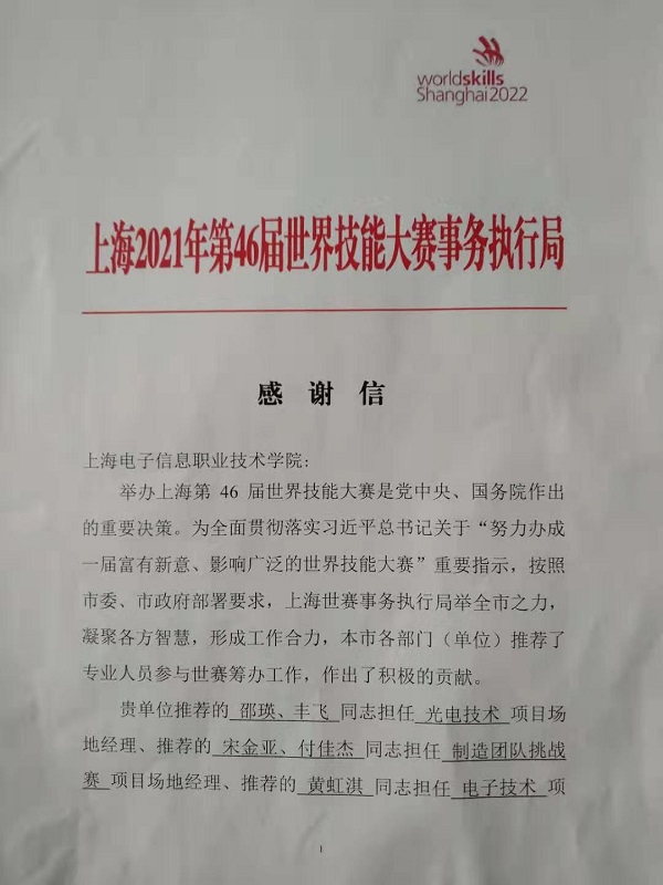 近日,学校收到上海2021年第46届世界技能大赛事务执行局的感谢信,感谢365官网在参与世赛筹办工作作出积极贡献。 信中指出,365官网推荐的邵瑛、丰飞同志担任光电技术项目场地经理、推荐的宋金亚、...