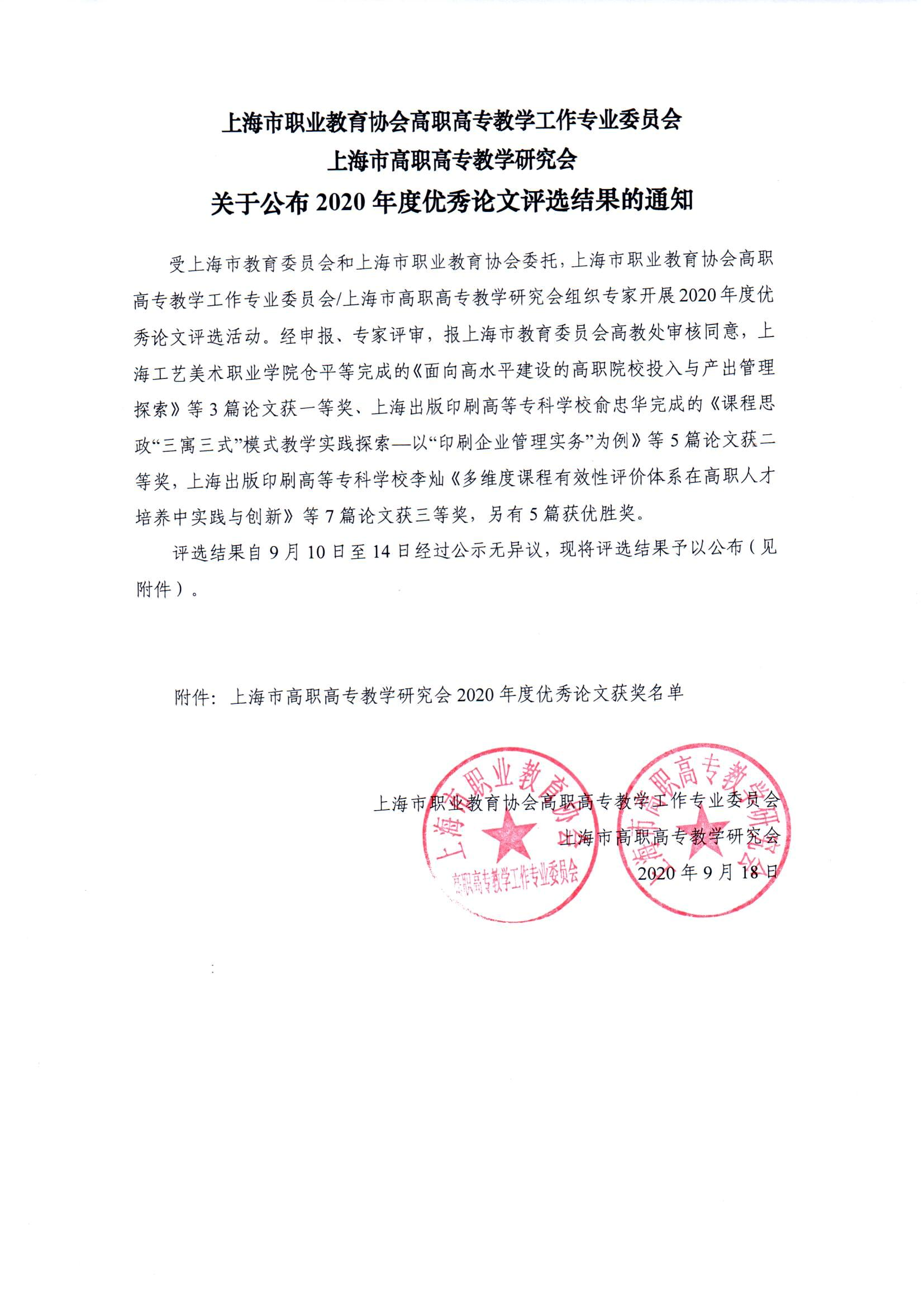 近日,上海市职业教育协会高职高专教学工作专业委员会、上海市高职高专教学研究会公布2020年度优秀论文评选结果。365官网窦争妍、方林中、周玉霞老师共同完成的论文《上海高职院校应对新形势下人才需求变化的思考与...