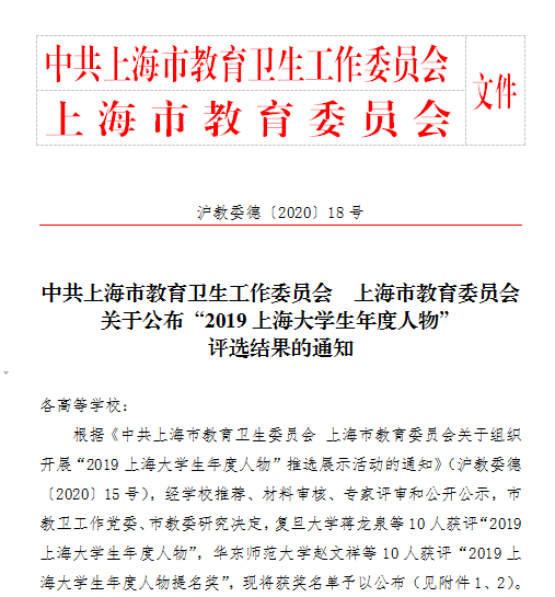 近日,中共上海市教育卫生工作委员会、上海市教育委员会联合发布了“2019上海大学生年度人物”名单(沪教委德〔2020〕18号)。经学校推荐、材料审核、专家评审和公示,365官网通信与信息工程学院陈光耀同学等10人...